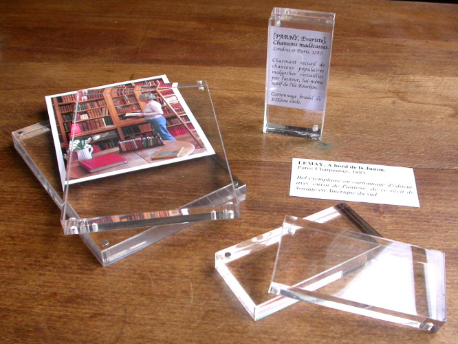 Made from crystal acrylic, they perfectly complement the bookstands and displays. They can be used in horizontal or vertical position, and the magnetic closure system allows instantaneous change of cards or labels.